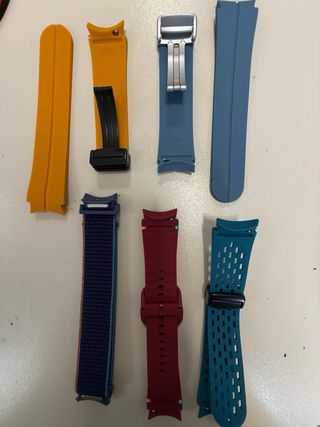 Lote de correas para smart watch Samsung Galaxy Watch 7, o para cualquier otro reloj cuyo ancho de banda sea de 20 mm. Ajuste perfecto. - una correa de silicona en color naranja. - una correade silicona en color azul claro. - Una correa de tela en color azul marino, borde naranja. Cierre tipo velcro. - Una correa de silicona en color burdeos. - Una correa de silicona en color azul con agujeritos. ⌚️vendida⌚️ Realmente bonitas faciles de colocar y de muy buena calidad. Precio por unidad. Se venden por separado. Broche con imán muy cómodo para poner y quitar. Lote entero 20
