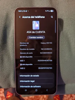 Teléfono móvil Samsung Galaxy A54 5G. - Modelo: SM-A546B/DS - Número de serie: RZCW81HR5VH - IMEI 1: 352009440167729 - IMEI 2: 354287570167721