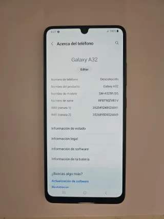 Teléfono móvil Samsung Galaxy A32. - Modelo: SM-A325F/DS - Número de serie: RF8T90ZVB1V - IMEI (ranura 1): 352049248526841 - IMEI (ranura 2): 352689508526849 En perfectas condiciones sin rayones ni golpes siempre con protector de cristal y poco uso se vende por cambio de modelo se uso 2 meses