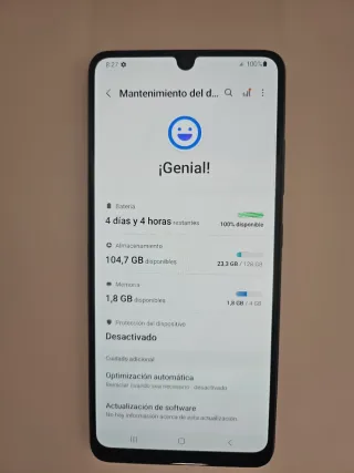 Vendo Samsung Galaxy S22 5G en su versión de 256GB de capacidad. El teléfono funciona perfectamente, como se ve en las fotos de diagnóstico de Samsung adjuntas. Estado: Pantalla en muy buen estado. El marco presenta las típicas marcas de uso/desgaste de la pintura negra por el roce con fundas (ver fotos en detalle). Batería: Salud de batería "Buena" según el test oficial de Samsung (incluyo captura). Capacidad: 256GB Almacenamiento / 8GB RAM. Extras: Se entrega con su caja original