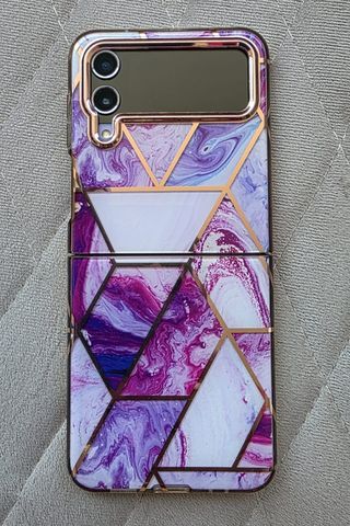Samsung Galaxy Z Flip4 5G, en perfecto estado. Cargador incluido. Funda con diseño geométrico y efecto mármol en tonos morados y blancos incluida. Incluye dos piezas: una para la parte frontal y otra para la trasera. Perfecto estado.