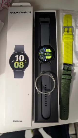 Samsung Galaxy Watch 5 en color gris con correas adicionales. ✅ Incluye correa amarilla. ✅ Incluye protector de pantalla transparente. ✅ Cargador original ✅ Muy cuidado.