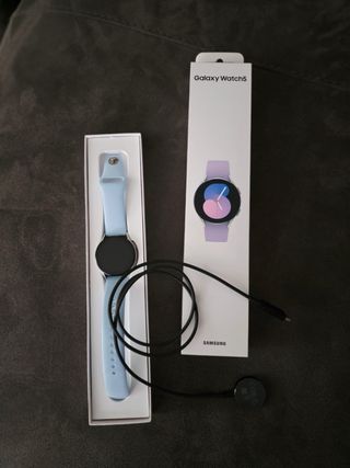 Reloj inteligente Samsung Galaxy Watch 5 en perfecto estado. - Correa de silicona en tono azul claro. - Incluye cargador inalámbrico. La correa original del reloj es la morada pero se cambio por otra ya que estaba desgastada del uso, pero se vende también con el reloj