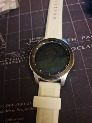 Vendo mi Samsung Galaxy Watch. Nuevo sin estrenar. Abierto para fotos y comprobar su funcionamiento. - Correa negra. - Esfera de color plata. - Correa de repuesto. - Cargador. - Manual de Instrucciones.