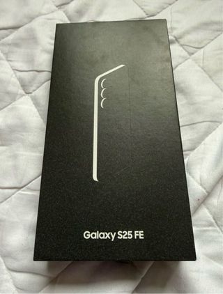 Caja para el Samsung Galaxy S25 FE. Presenta un diseño elegante y minimalista. - Caja negra con el logo de Galaxy S25 FE. - Ilustración del contorno de un teléfono en blanco.