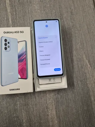 Teléfono móvil Samsung Galaxy A53 5G en color azul. - Pantalla de 6.5 pulgadas. - Cámara principal de 64 MP. - Batería de 5000 mAh. - Tiene colocado protector de pantalla. - Más 3 fundas de movil.