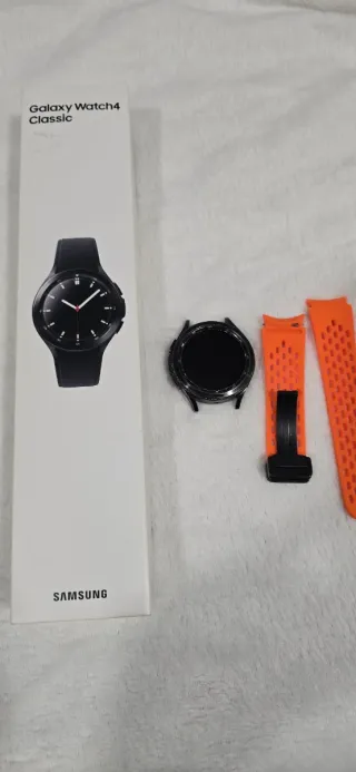 Reloj inteligente Samsung Galaxy Watch 4 Classic. - Caja de 45 mm. - Bisel giratorio. - Correa intercambiable.... El reloj funciona genial ..tine unos defectos de rayones minimos en el cristal de safiro y marcas de uso .. esta muy bien seve la pantalla muu bien si desea ponerle un protector queda mejor caja sus dos correas unico dueño... wear os notifica todo y mejoras en actualizaciones