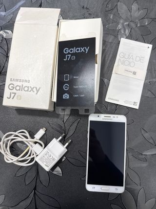 Teléfono móvil Samsung Galaxy J7 en color blanco. Incluye cargador y guía. -incluye cargador y cable, 3 protectores de pantalla - Pantalla Super AMOLED. - Cámara de 13MP / 5MP. - Cuerpo metálico.