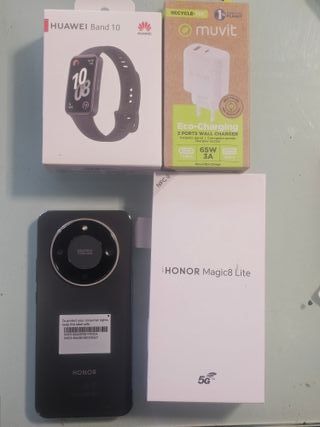 Teléfono móvil Honor Magic8 Lite en color negro. Cargador doble rápido y huawey band 10 de regalo esta solo abierto para las fotos no se llego a encender - Capacidad de almacenamiento de 512 GB. - Conectividad 5G y NFC.