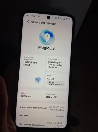 HONOR 200 Smart 256GB – Como nuevo Vendo HONOR 200 Smart en perfecto estado. Muy cuidado y funcionando perfectamente. 🔹 Pantalla: 6,7" Full HD+ (2412 x 1080) 🔹 Procesador: Snapdragon 4 Gen 2 🔹 RAM: 4 GB + 4 GB RAM Turbo 🔹 Almacenamiento: 256 GB 🔹 Batería: 5200 mAh (gran autonomía) 🔹 Sistema: MagicOS 9 🔹 Modelo: ALT-NX1 Estado: muy buen estado, sin fallos. Batería dura todo el día sin problema. Mucho almacenamiento para apps, fotos y vídeos.