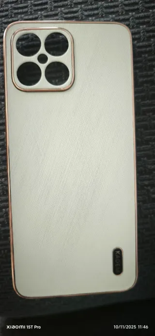 Funda protectora para Honor X8/30 con un diseño elegante. - Acabado texturizado en color blanco roto. - Marco lateral en tono dorado. - Diseño de cámara con cuatro aberturas. - Detalle de logo en la parte inferior..