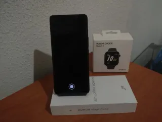 Se vende teléfono móvil Honor Magic7 Lite junto con un reloj inteligente Honor Choice Watch 2i. - Teléfono móvil de color gris oscuro. - Reloj inteligente Honor Choice Watch 2i. Se ha usado sólo dos meses esta en buen Estado lo compras y te llevas incluido el reloj inteligente, precio negociable, estoy a la orden cualquier pregunta