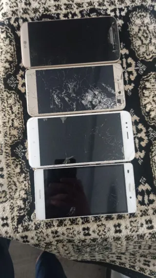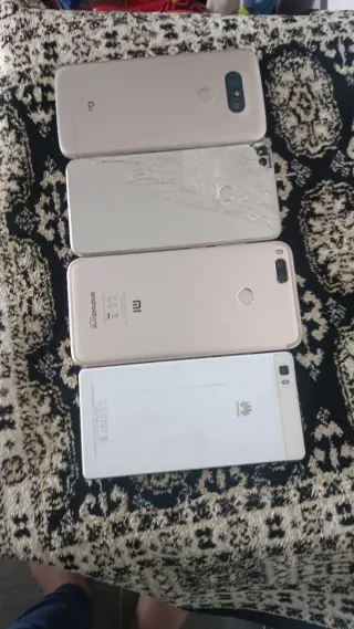 Lote de cuatro teléfonos móviles para piezas. Incluye modelos de las marcas LG, Xiaomi y Huawei. Y honor todos son para piezas o para arreglar - VENTA EN PERSONA - SE ESCUCHAN OFERTAS - Teléfono LG color dorado. - Teléfono Xiaomi color dorado. - Teléfono Huawei color plateado. - Teléfono con pantalla rota.
