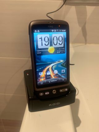 HTC Desire funcionando. Se suministra con cable de carga y una segunda batería de repuesto ORIGINAL. También se entrega una estación de carga KIDIGI que permite cargar el móvil y la segunda batería a la vez. Cables de carga y de estación de carga incluidos. Sistema operativo ANDROID. Libre.