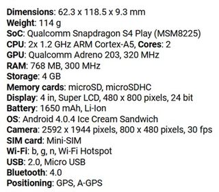 Detalles técnicos en la 2a imagen. Incluye caja y cable de carga. No incluye cargador. * El móvil funciona pero al quitar la tapa para poner la SIM los pulsadores de encendido y volumen se caen. Hay que recolocarlos con cuidado