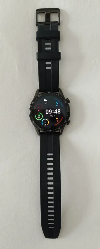 Reloj inteligente Huawei Watch GT 2 en color negro y tamaño de 46mm. - Diseño deportivo y elegante. - Pantalla con información de actividad. - Correa cómoda para uso diario. Smartwatch de Huawei, modelo GT2: Tipo de conectividad Bluetooth 5.1, GPS, GLONASS Pantalla 1,39" AMOLED táctil, 454 x 454 píxeles, 326 ppi Resistencia 5ATM (sumergible hasta 50 m) Material cuerpo Metal y plástico Lectura de mensajes (WhatsApps, e-mails, sms) Recibe y realiza llamadas de voz.