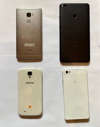 Se venden cuatro teléfonos móviles usados, ideales para reparar o para piezas. Dos son Huawei, uno Samsung y otro Xiaomi. Algunos presentan desperfectos en la pantalla. - Incluyen dos teléfonos Huawei, uno Samsung y uno Xiaomi. - Perfectos para reparar o usar como piezas. - Algunos tienen la pantalla dañada.