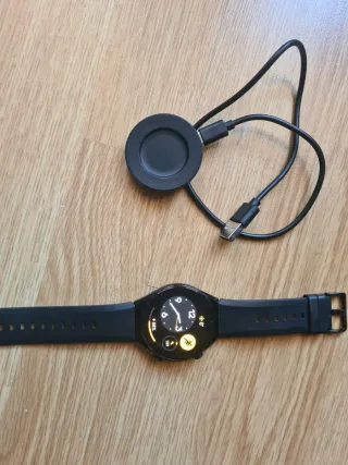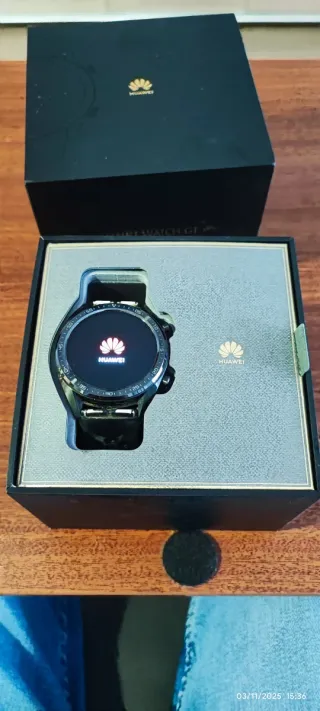 Reloj inteligente Huawei Watch GT en perfecto estado. Se entrega en su caja original con cargador inalámbrico y instrucciones. Se puede ver y probar sin compromiso. La correa tiene signos de desgaste. Muy fácil cambiarla.
