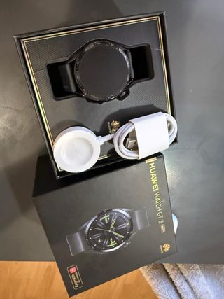 Reloj inteligente Huawei Watch GT 3 de 46mm en color negro. Incluye cargador. - Esfera redonda. - Correa negra. - Incluye base de carga inalámbrica.