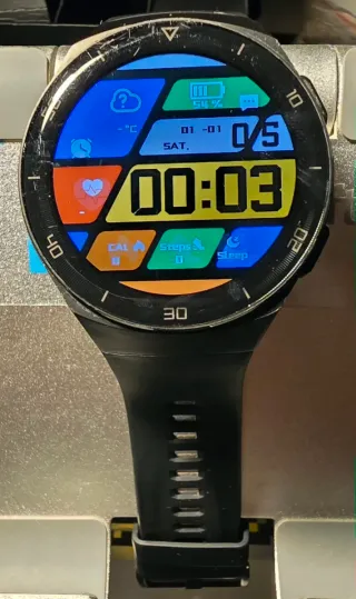 Reloj inteligente Huawei Watch GT 2e con un diseño deportivo. - Correa negra ajustable. - Rayas en la pantalla que no impiden su uso. -La app se llama Huawei salud. -Incluye cable para cargar perl no cargador.