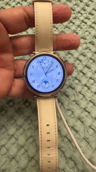 Reloj inteligente Huawei Watch GT con correa beige y detalles dorados. - Esfera con números romanos. - Indicador de día de la semana y fase lunar.