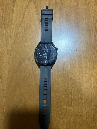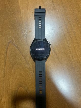 Reloj inteligente Huawei Watch GT 2 en color negro. Modelo DAN-B19. La pantalla está en buen estado, tiene una pequeña marca en un lateral pero apenas se aprecia puesto. La correa está desgastada pero el reloj es compatible con correas normales y es muy fácil de cambiar.