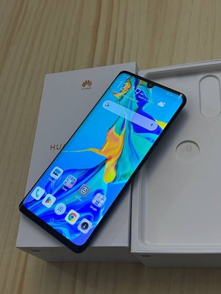 Teléfono móvil Huawei P30 Pro en color negro, con caja y cargador muy cuidado - Pantalla con bordes curvos. - Cámara triple en la parte trasera.