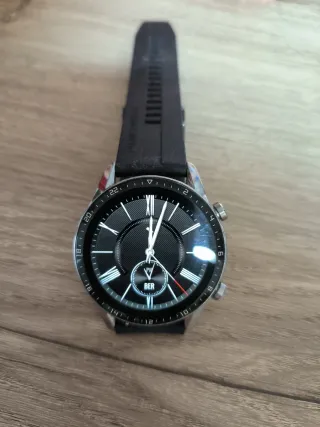 Elegante smartwatch Huawei con un diseño moderno y sofisticado. - Esfera principal en color negro. - Bisel y detalles en acabado plateado. - Correa negra de material resistente. En perfecto estado, batería nueva.
