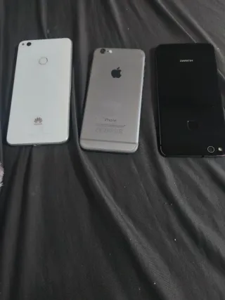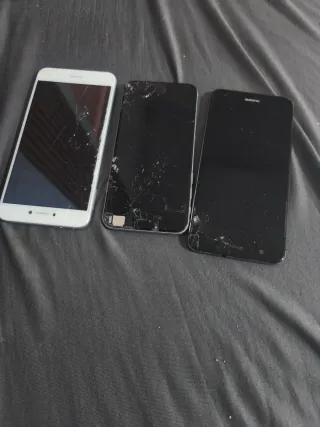 Lote de teléfonos móviles de las marcas Apple y Huawei, ideales para obtener componentes o para reparar. - Teléfono móvil Apple plateado. - Teléfono móvil Huawei blanco. - Teléfono móvil Huawei negro.