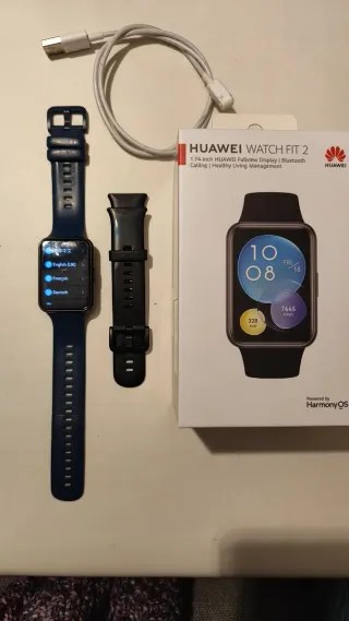 Smartwatch Huawei Watch Fit 2 en color negro con correa azul. Incluye cable cargador y correa negra original que se cambió por desgaste. - Pantalla FullView de 1.74 pulgadas. - Conectividad Bluetooth. - Gestión de salud. - Realiza llamadas en modo manos libres. Batería: uso normal hasta 10 días, intensivo con llamadas y tracking deportivo hasta 6-7 días. Se carga en media hora.