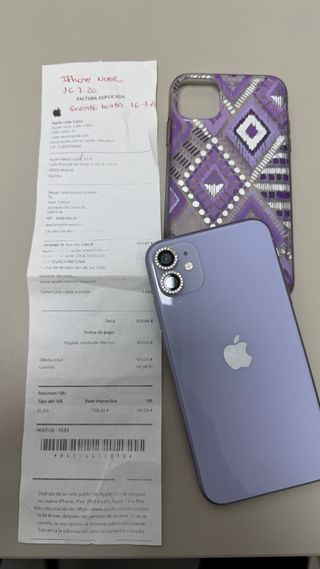 iPhone 11 en un llamativo color Malva y con gran capacidad de almacenamiento. - 128GB de almacenamiento interno. - Color Malva. Incluye caja y fundas, con protector de pantalla nuevo y marco para ponerlo. En la parte inferior tiene un pequeño rasguño que se ve en la foto.