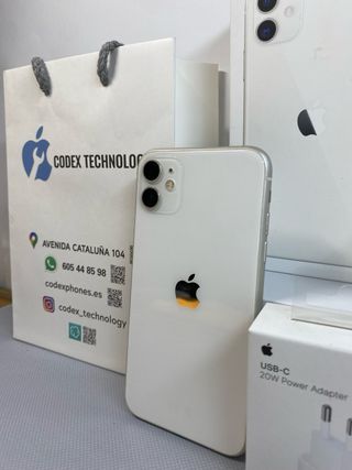 Teléfono móvil iPhone 11 en color blanco. Capacidad de almacenamiento de 128GB. + cargador y. cable + carcasa de protección