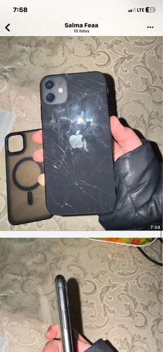 iPhone 11 en color negro, .Se incluye funda MagSafe. - parte de atras rota . - Funda protectora negra con imán para MagSafe. -tiene un 68% -escucho todas las ofertas