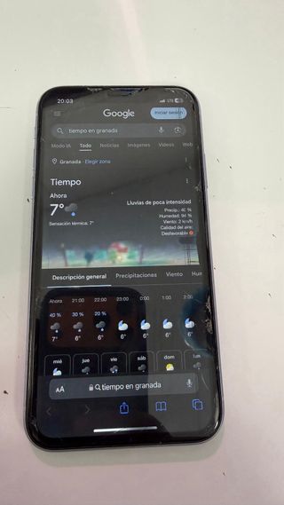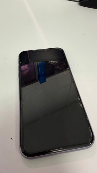 Teléfono móvil iPhone 11 en color morado. La pantalla presenta algunas grietas. Tiene partido el protector de pantalla Necesita cambiarle la pantalla - Pantalla de 6.1 pulgadas. - Cámara dual de 12 MP. - Chip A13 Bionic.