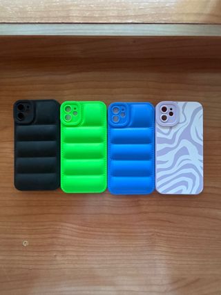 Conjunto de cuatro fundas para iPhone 11 con diferentes diseños. - Funda negra acolchada. - Funda verde neón acolchada. - Funda azul acolchada. - Funda lila con estampado de cebra.