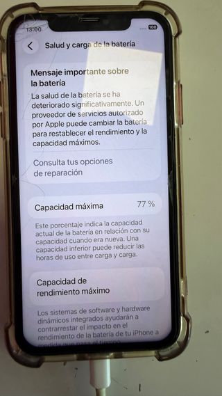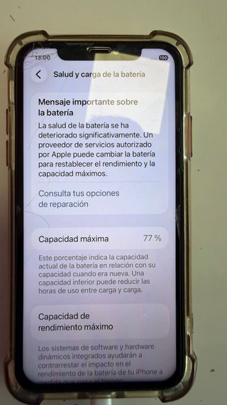iPhone 11 en color negro con 256GB de almacenamiento. La salud de la batería se ha deteriorado significativamente. - Capacidad máxima de la batería: 77% - Mensaje importante sobre la batería: La salud de la batería se ha deteriorado significativamente. Un proveedor de servicios autorizado por Apple puede cambiar la batería para restablecer el rendimiento y la capacidad máximos. - Capacidad de rendimiento máximo: Los sistemas de software y hardware dinámicos integrados ayudarán a contrarrestar el impacto en el rendimiento de la batería de tu iPhone a medida que pasa el tiempo.