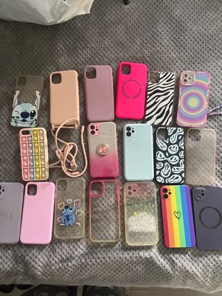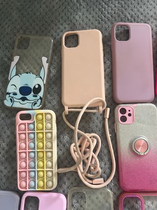 Lote de fundas para iPhone 11 con diversos diseños y colores. - Funda transparente con dibujo de Stitch. - Funda rosa lisa. - Funda morada lisa. - Funda fucsia con círculo. - Funda con estampado de cebra. - Funda con diseño de círculos arcoíris. - Funda con pop it. - Funda rosa con pop it. - Funda transparente con brillo y anillo. - Funda transparente con dibujo de Stitch y corazones. - Funda transparente con borde rosa. - Funda transparente con brillo. - Funda con diseño de arcoíris. - Funda morada lisa con anillo.