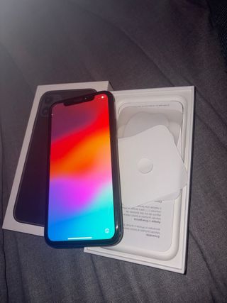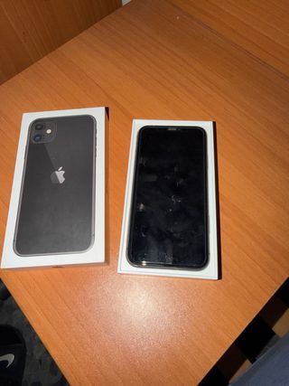 Teléfono móvil iPhone 11 en color negro. Carga bien pero mientras esta enchufado si lo mueves mucho se desconecta Por lo demás funciona todo bien Tiene protector de pantalla puesto No incluye cargador solo caja original