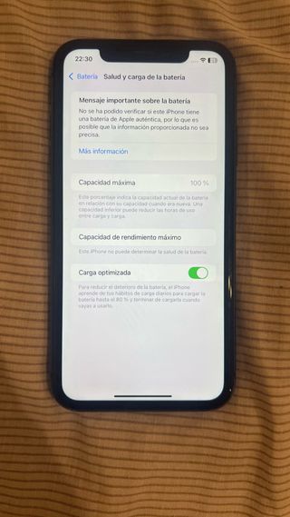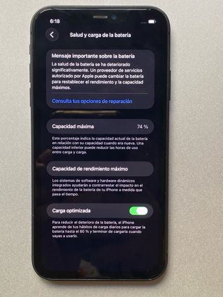 iPhone 11 con un mensaje importante sobre la salud de la batería. La capacidad máxima actual es del 75%. - Un proveedor de servicios autorizado por Apple puede cambiar la batería. - Opción de carga optimizada activada.