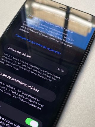 iPhone 11 con 128GB de almacenamiento. - Capacidad máxima de batería del 74%. - Mensaje importante sobre la salud de la batería.