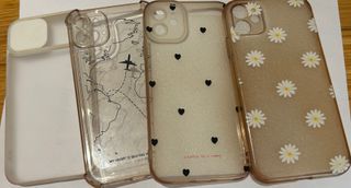 Lote de tres fundas para iPhone 11 con diferentes diseños. - Funda transparente con mapa y avión. - Funda transparente con corazones negros. - Funda transparente con flores de margarita y purpurina.