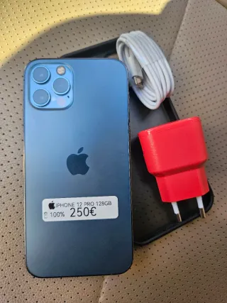 iPhone 12 Pro en color azul pacífico con una capacidad de 128Gb Salud de la batería: 74% Funciona perfectamente Incluye caja original y cable USB Muy cuidado, nunca reparado Siempre usado con funda y protector