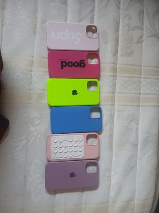 (Una solo por 5€ el pack a 20)Se venden seis fundas para iPhone 12 mini en colores variados. Están en buen estado. - Colores: rosa claro, rosa fuerte, verde lima, azul, rosa palo y morado. - Material: silicona. - Diseño: liso, con logo Apple y otros estampados.