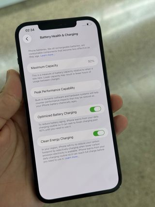 iPhone 12 Pro con 128 GB de almacenamiento. La pantalla muestra el estado de la batería. - Capacidad máxima de la batería: 80% - Capacidad de rendimiento máximo