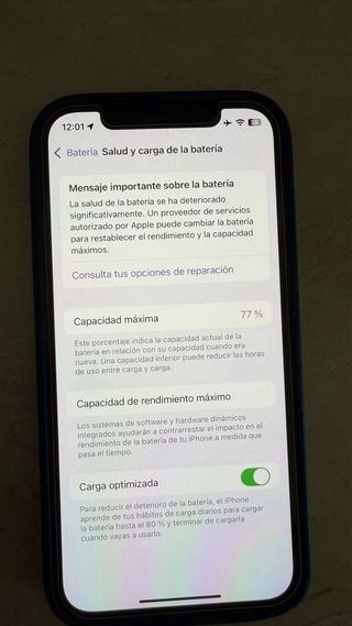 iPhone 12 Pro Max con 128GB de almacenamiento. La batería tiene una capacidad máxima del 73% y se recomienda consultar opciones de reparación. Igualmente únicamente usado para fotografía y video nunca reparado Igual le dura el Dia completo la carga Con cargador original y su factura de compra Solo detalles de uso por los soportes de estabilizadores de camaras - Capacidad máxima: 73% - Carga optimizada activada