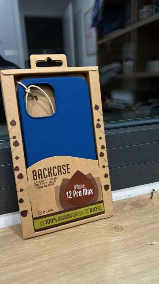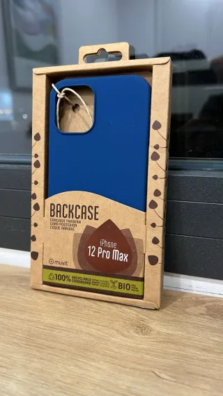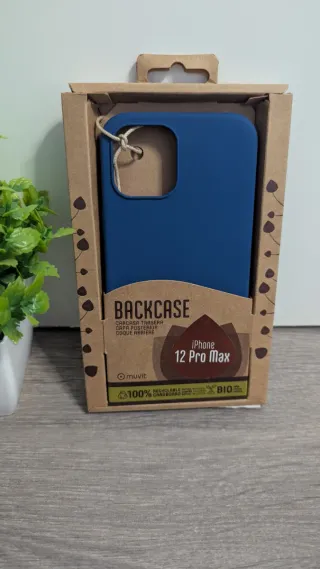 Funda trasera de la marca Muvit para iPhone 12 Pro Max. - Color azul. - Fabricada en cartón 100% reciclable. - Diseño BIO.