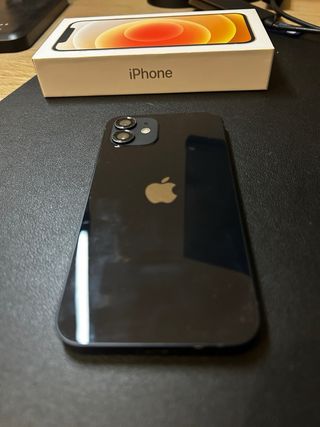 Teléfono móvil iPhone 12 en color negro como nuevo, pantalla sin arañazos, siempre con funda y protector. Cargador y cable original - Pantalla de 6.1 pulgadas. - Capacidad de almacenamiento de 128G. - 76% Batería