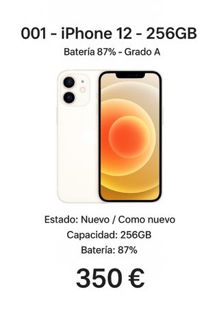 iPhone 12 en estado impecable, sin golpes ni arañazos. Funciona perfectamente y está revisado. Ideal para uso diario, redes sociales y trabajo. Móvil rápido y muy fiable. - Capacidad: 256GB - Batería: 87% - Grado: A