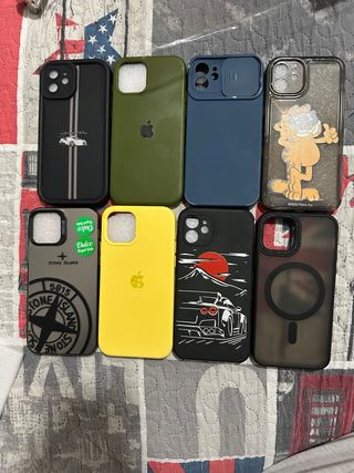 Lote de fundas y caja para iPhone 12. - Funda negra con diseño de coche deportivo. - Funda verde con logo de Apple. - Funda azul con tapa para cámara. - Funda transparente con personaje de Garfield. - Funda gris con logo de Stone Island. - Funda amarilla lisa con logo de Apple. - Funda negra con diseño de coche y montaña. - Funda negra con anillo magnético.