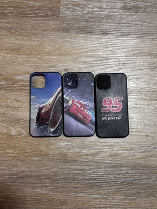 Tres fundas para iPhone 12 con diseños de Cars. - Diseño de Rayo McQueen en carrera. - Diseño de Rayo McQueen con estrellas. - Diseño de Rayo McQueen con el número 95.